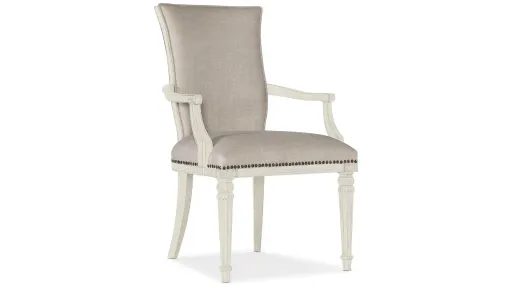 Inspired by European antiques and architecture, the Traditions Upholstered Arm Dining Chair has classic carved French legs and a calming monochromatic color palette, pairing the soft white magnolia finish with the biscuit performance fabric cover in 100% linen on the upholstered seat and back. Nailhead trim around the seat and back and a wood handle at the top of the back add delightful details.