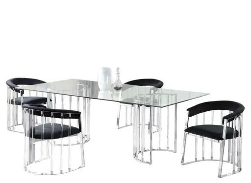 A contemporary dining must-have; the Trisha 5-pc. Dining Set are sure to take your dining area to the next level. Set atop two semi -circle base pieces, the steel and acrylic features will add a polish you're sure to appreciate. Sit in style with the daring contemporary design of this semi-circle steel and acrylic frame armchair, with luxurious black velvet fabric upholstery and a comfortable waterfall edge seat.