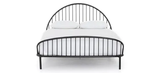 The Truett King Bed is soft and feminine with a found feel. Hand-wrought iron is shaped into an intriguing arc, with open railing for a light look.