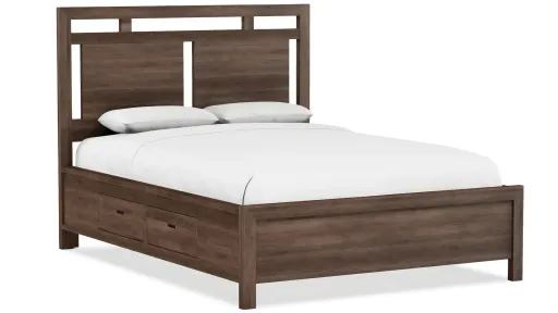 Effortlessly update your entire bedroom with the Urbane high-profile storage bed. A clean-lined frame in warm, richly grained wood sets the foundation, while the panel headboard with cutouts showcases a modern interpretation of a Mission style. The open design feels light and airy for winding down or welcoming the new day. Two integrated storage drawers keep clutter tucked away so your space looks intentionally styled.