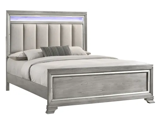 The Vail queen panel bed will bring a whole new level of style to your bedroom. This piece is carefully crafted with decorative beveled mirror accents to enhance the design. The channeled upholstered headboard has a beautiful wood frame with mirror accents that features LED lighting with a three touch control. You can enjoy your oasis for years to come.