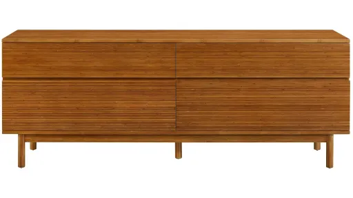 The quiet elegance of the Ventura Double Dresser is all about celebrating the beautiful grain of solid Amber bamboo. The modern style and simple clean lines of the double dresser show off the rich variety of Amber's colors and feature a craftsman-built frame made from solid bamboo, resting on legs that lift the chest up off the floor. Four wide solid bamboo drawers display expanses of rich bamboo grain uninterrupted by hardware, with each drawer beautifully finished inside and out. Each drawer is built using English dovetail joinery, and sit on under-mounted, soft-close glides for easy opening and closing. Sustainable and earth friendly, Amber is not a surface stain, the color is the result of an innovative new process using earth friendly heat and steam, to entirely transform the solid bamboo material into Amber's deep color. Made using an earth friendly, renewable resource harvested from fully sustainable and rapidly growing forests.