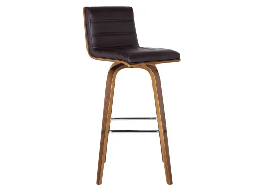 Indulge in luxury with the Vienna swivel counter stool. It is beautifully designed with a sturdy metal-framed footrest, a walnut wood finish, brown leather-look upholstery and a walnut back. This piece provides both versatile style and comfort with a Mid-Century Modern design that can easily be integrated into your home's current decor.