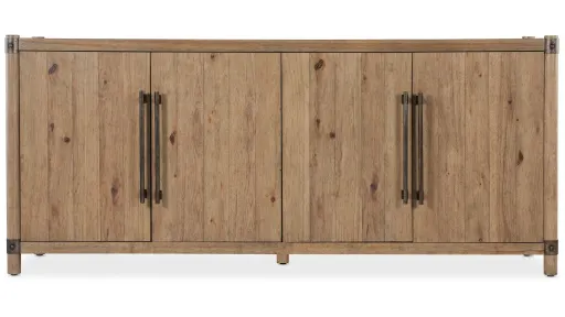 Capture the essence of the Napa Valley feeling with the Vineyard Row Entertainment Credenza. Combining Pecky Hickory Veneers with visible knots and rustic hammered metal accents, it is finished in the light-and-airy Sonoma hue. The credenza features 4 doors with soft-close hinges and magnetic catches, two adjustable wood shelves behind each pair of doors and a ventilated back panel and wire management behind each pair of doors. Accommodates up to a 75-inch TV.