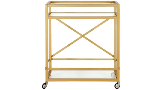 This Warbler bar cart features streamlined design and modern style. Two-tier glass shelves add to its efficient usage. It features secured top tray with handles on all sides while the bottom is secured with elevated metal bars. The wheels provide easy mobility while you are hosting any party.