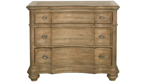 Weston Hills bachelor's Chest features three drawers with felt-lined tops and cedar-lined bottoms, accented with understated pewter-finished knob hardware for an effortless look. White cerusing on cathedral hickory veneers enhances the grain and adds softness to the warm tones of the wood. Shapley fronts, rounded corners, and walnut inlays add distinction and character. Weston Hills --perfectly timeless, perfectly today, perfectly you.