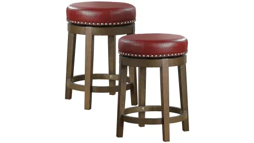 Transitional styling paired with versatility of selection makes the Whitby stool a perfect addition to your home's casual dining spaces. The round, swivel seat, counter height stool is presented at 24-inches. The brown finished wood legs complement the red faux leather seat which features nailhead trim that further defines the stool's round profile.