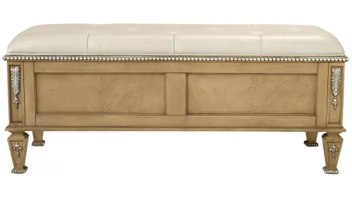 The Wilshire storage bench is an updated spin on a familiar, centuries-old design. The sheer grandeur of periods past can be seen in its bisque finish with silver tipping and detailed carvings. Plus, the expertly tailored bonded-leather upholstery provides an added touch of luxury.