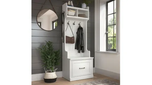 The Woodland Home Hall Tree and Shoe Bench with Drawer combines transitional styling and a practical design to offer an ideal entryway organizer. Have a seat on the durable bench surface and take a moment to relax as you get ready to head out the door or come home after a long day. The mudroom bench supports 250 pounds, so you can sit down to put on and take off your shoes or set shopping bags down after a trip to the store with confidence. A small drawer opens on smooth ball bearing slides for easy access to footwear and accessories. The narrow Hall Tree features five coat hooks for hanging jackets, hats, scarves and more. Smaller items can be stashed neatly inside two open compartments.