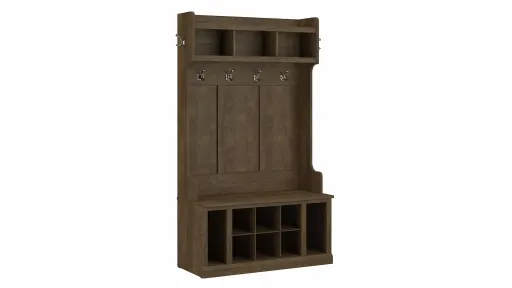 The Woodland Home Hall Tree and Shoe Storage Bench with Shelves combines transitional styling and a practical design to offer an ideal entryway organizer. The top of the mudroom bench supports up to 250 pounds, so you can sit down to put on and take off your shoes or set shopping bags down after a trip to the store with confidence. Open storage that includes six cubby spaces and vertical shelves on either side keeps footwear in order. The Hall Tree features six coat hooks for hanging jackets, hats, scarves and more. Smaller items like gloves and keys can be stashed neatly inside three open compartments, and the top shelf provides an area to brighten up your entryway with decorations.