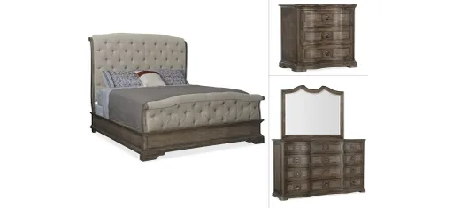 Grand, plush and button-tufted, the Woodlands Upholstered Bedroom Set is an iconic centerpiece for any master suite. Inspired by the great mansions of America's Gilded Age, the side rails, shaped footboard and swirled, shaped outline of the dramatic headboard are crafted of Poplar and Hardwood Solids and Quartered Oak Veneers. The serene and versatile finish, Heathered Lambswool, beautifully melds gray and brown tones. The headboard is upholstered in Lenox Taupe.