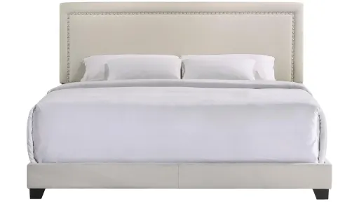 The Zion Upholstered Bed Collection features a Fog Fabric covering a sleek Headboard with Matte Chrome Nail Head Accents. The Poplar and Rubberwood Construction rounds out this collection, making it not only stylish but durable as well. These beds are offered as King, Queen, Full, and Twin sizes, so you can find the perfect fit for your space.