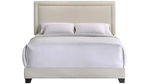 The Zion Upholstered Bed Collection features a Fog Fabric covering a sleek Headboard with Matte Chrome Nail Head Accents. The Poplar and Rubberwood Construction rounds out this collection, making it not only stylish but durable as well. These beds are offered as King, Queen, Full, and Twin sizes, so you can find the perfect fit for your space.