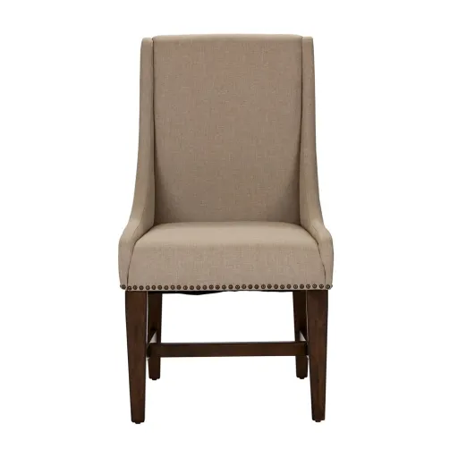 Armand, inspired by a 17 century French antique. Pulling in Tuscan elements for the dining the rectangular trestle table features heavy square turned bases. Square back, armless upholstered chairs feature linen upholstery with a nail head trim on the base of the chair. The buffet features 4 door panels with overlays and pilasters chamfered for a soft appeal. Cases feature overlays on the top drawers, framed drawer panels, block feet and chamfered posts. Media features drop down fronts so it can double as a small dresser with the landscape mirror for smaller spaces.