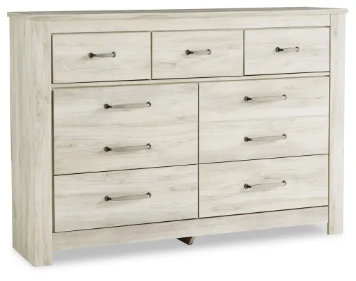 Your bedroom isn’t just a room. It’s a canvas. Express your farmhouse style with this dresser. Wispy white finish over replicated oak wood grain brightens up the space with charm. Brushed nickel-tone handles with black edging finesse the piece with a bit of shine. Drawers are spacious and lined with faux linen laminate to hold your belongings with care. This clean-lined profile is the perfect authentic foundation for inviting decor.