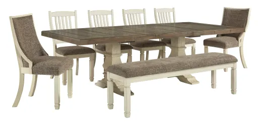 The Bolanburg 8-Piece Dining Set with Bench offers a charming farmhouse aesthetic with a two-tone finish. The table features a distressed antique white base and a dark oak top, while the chairs and bench have matching antique white bases and oak-stained seats. This set includes one table, four side chairs, two arm chairs, and one bench, providing ample seating for family and guests. The chairs and bench are upholstered in a neutral polyester fabric for comfort. The table extends with a 18-inch leaf, making it perfect for gatherings. The distressed finish adds a touch of rustic charm.