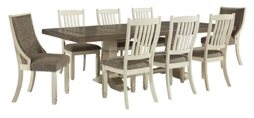 The Bolanburg dining set offers a charmingly rustic appeal with a distressed vintage charcoal finish. This set includes one extendable dining table, six upholstered side chairs, and two upholstered arm chairs, providing ample seating for gatherings. The table features a planked effect and a self-storing leaf, making it easy to expand for more guests. The chairs are upholstered in a durable polyester fabric with a neutral gray tone, offering comfort and style. The distressed finish on the table and chair legs adds to its unique character.