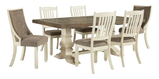 The Bolanburg Collection offers a relaxed yet refined aesthetic for your dining space. This 7-piece dining set includes four side chairs, two arm chairs, and one dining table, all crafted with a two-tone finish that blends a distressed chalk white with a warm antique brown. The table features a sturdy pedestal base and a spacious top, perfect for family gatherings. The chairs showcase a classic ladder-back design with comfortable upholstered seats in a neutral fabric. The two-tone finish adds a touch of rustic charm and vintage appeal, making this set a versatile addition to any dining room.