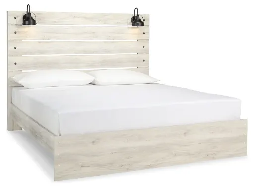 What a delightful take on rustic industrial style. Whether modern loft or modern farmhouse, this king panel bed makes itself at home. The wispy whitewash palette enhances without covering the grain for that weathered look you crave. Love to read in bed? You’re sure to find the retro-chic light sconces and USB plug-ins on the open-slat style headboard such a bright idea.