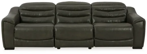 For those seeking to curate a living room retreat that offers superior comfort and a contemporary aesthetic, this sleekly designed power reclining sectional will become your favorite source of at-home serenity. Rest on expertly matched leather and faux leather upholstery, and use the one-touch power control to recline and adjust the headrests with ease. As you recharge after a long day, your devices can too with USB charging. This sectional is visually enticing in a luxe dark gray, with slope track arms and stitched detailing on the back to enhance its modern appeal.