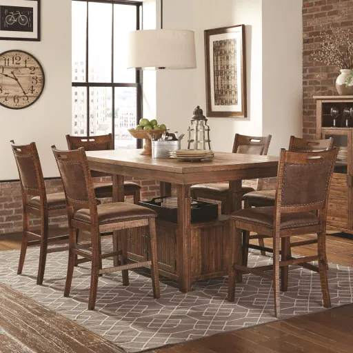 This casual counter height pub table and stool set will make a wonderful centerpiece to a casual dining or entertainment area. The table has convenient built in storage and a charming rough finish with planked panels. The matching stools have upholstered seats and backrests and are accented with nailhead trim.