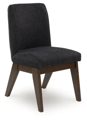 Casual contemporary styling with a decidedly modern vibe. Sitting atop a mid-century inspired base, this upholstered bucket dining chair has a rich warm brown finish that beckons everyone to gather around. Black textured upholstery dresses the chair in on-trend elegance. It