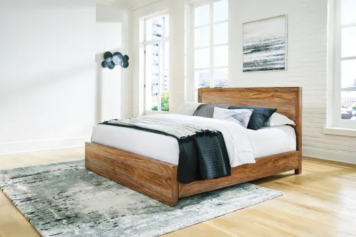 Discover something extraordinary with the clean-lined Dressonni king panel bed. The rich natural beauty of the wood, enhanced with a clear wood-tone finish, brings an organically stunning vibe to your bedroom. This strikingly simple low profile bed creates the understated, modern look you want to wake up to every morning.