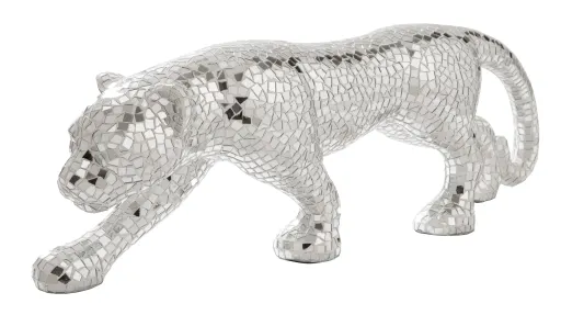 Decorate your home with this iconic mixed media sculpture. Featuring mosaic glass and paper composite, this panther will add an exotic element to any space. Create a fierce look in your bedroom or luxurious allure in your living room with this unique and thought-provoking piece.