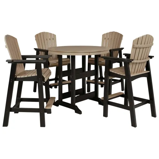 Raise the bar on outdoor living with this 46" round bar table set with umbrella hole. Crafted for style, comfort and durability, this outdoor entertainment table caters with a standout two-tone finish that pairs a light driftwood-look and black finish for twice the interest. Round table design keeps everyone in the flow of conversation. Assembly required.