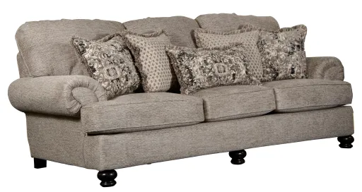 Design your living space to be both an elegant entertainment space and casual retreat, with help from this sofa. Features such as, deep seating and generously rolled arms provide both comfort and style. While, decorative accent pillows and solid wood bun feet help add a refined sense of style to your home.