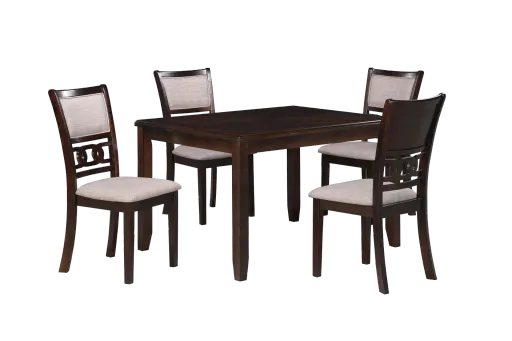 Contemporary and stylish, this dining table and chair set will transform your dining room into the modern marvel you have been searching for. Plush seat and seat backs accented with a lovely circle motif give the chairs a chic look. The table comes with a handy shelf so you can keep plates and serving trays within easy reach. Completed in your choice of several handsome finishes, this dining table and chair set is the perfect addition to your home.