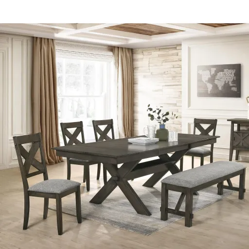 With a rustic brown finish, a traditional trestle style base, and the ability to extend from seating six to eight at a moment