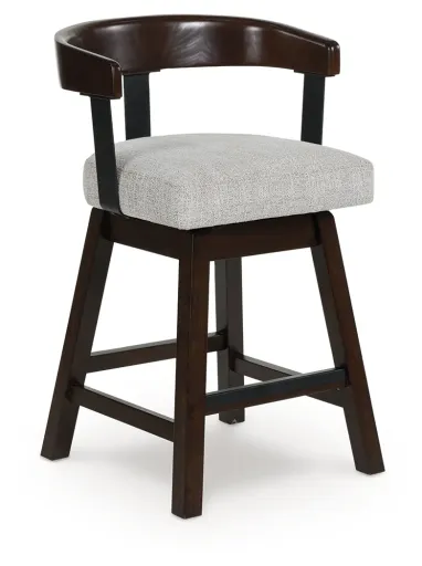 Modern sophistication, beautifully served. This swivel counter height stool raises the bar with a cool, contoured back design with a comfortably cushioned seat. Dark and rich, the monochromatic finish enhances its sleek profile. A seamless 360-degree swivel feature offers functional appeal.