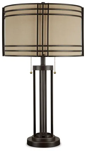 Add a touch of rustic industrial style to your decor with this eye-catching table lamp. Its drum shade and decorative metal frame bring an appealing touch to your home. A dark brown finish complements the shade