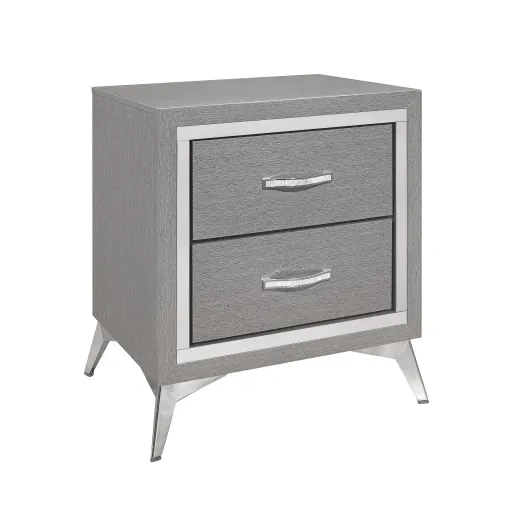 The Huxley 2-Drawer Nightstand in Gray combines contemporary glam with durable construction, making it a perfect addition to any modern bedroom. This nightstand is carefully crafted from manufactured woods and eco-friendly decorative laminate, ensuring it will last for years. Featuring clean lines with metallic accents and flared silver legs, it adds a modern touch to your space. The inviting gray finish provides a sleek, sophisticated look that complements contemporary interiors, creating a calming atmosphere. The neutral tone pairs beautifully with the metallic accents and luxurious details, adding a touch of glamour and cohesion to the overall design. The quality drawer construction includes English dovetail joinery and smooth-rolling center glides for long-lasting operation. Functional and fashionable, the two spacious drawers offer ample room for bedside essentials, while chic, crystal-studded drawer pulls provide easy access. The Huxley 2-Drawer Nightstand in Gray offers a stylish and durable solution for your bedside storage needs, combining contemporary elegance with practical functionality.