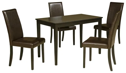 Contemporary in style and small in scale, this rectangular table set fits nicely in any dining space or kitchen. You will enjoy casual meals and entertaining with this table at the heart of your room. It is made with select veneers and hardwood solids in a dark brown finish that make it a fit for any decor. Slim tapered legs complete the table. Brown faux leather side chairs add seating.