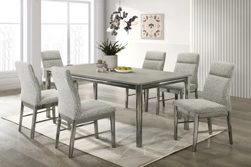 This contemporary 7-piece dining set is perfect for those who want to add a touch of modern elegance to their dining space. The set is crafted from solid rubberwood, a durable and versatile material, and features a beautiful gray wood tone with a specialty metallic finish that adds a hint of sophistication. The rectangular table top is made of wood and has a standard dining height, making it comfortable for everyday meals and special occasions alike. The table legs provide sturdy support and a clean, minimalist look that complements the contemporary design style. This dining set seats six people comfortably, with six side chairs included to complete the set. The chairs are designed to provide a comfortable seating experience, and the set