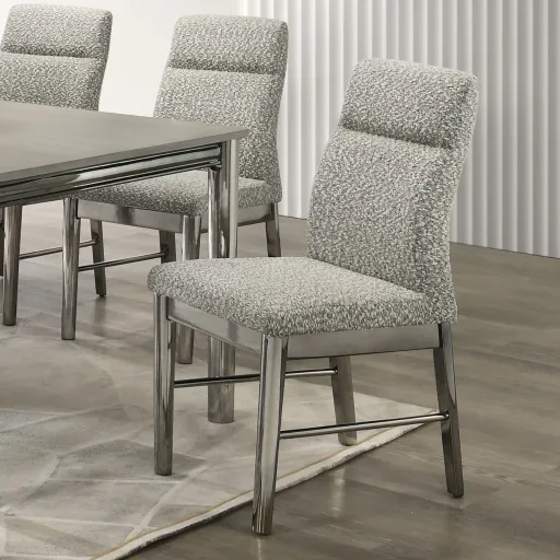 The Lennox Upholstered Side Chair, sold as a set of two, brings together exceptional craftsmanship, sophisticated design, and unmatched comfort to elevate your dining experience. Expertly crafted from premium solid Rubberwood and genuine Ash wood veneers, these chairs ensure long-lasting durability while maintaining a refined and elegant look. The sleek design features rounded legs and seat frames with a metallic silver finish that perfectly complements the soft neutral tones of the pale gray fabric. Upholstered in luxurious boucle fabric, these chairs offer a plush, textured elegance that provides both high-end comfort and a warm, inviting charm. Ideal for both everyday dining and special occasions, the Lennox Side Chairs are a perfect blend of style and practicality.