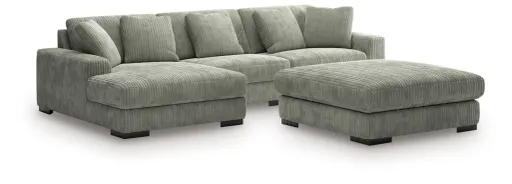 Plush and posh. Showcase your eye for on-trend texture with the statement-making cord upholstery of this sectional and ottoman set. Its stunningly soft fabric entices in a warm neutral hue, complementing contemporary color palettes. Sink into the cushions and plan to stay a while—this cozy living room centerpiece highlights your high-end approach to comfort and style.