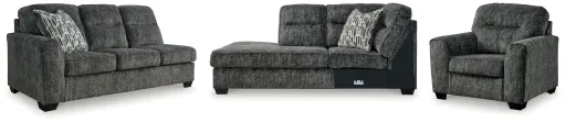 This sectional with chaise speaks to those drawn to fresh, contemporary style with richly neutral appeal. Subtle and sophisticated, the plush upholstery and dark tri-block legs are a natural complement for so many color schemes. On-trend track arms provide great support. Curling up on this sectional to enjoy a night in is never out of the question. Matching oversized chair included.