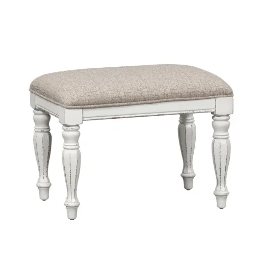 Showcasing beautiful turned legs, this accent bench makes a wonderful addition to your home. Highlighted by a supportive and upholstered seat for extended comfort, it fits perfectly with your relaxed vintage decor. Completed with an antique white finish, this stool presents wonderful design and exceptional craftsmanship.