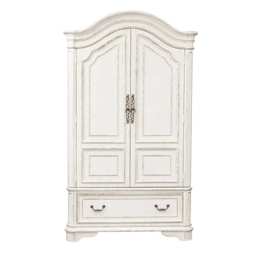 Add classic storage and style to your bedroom with this beautiful armoire. Two doors open to reveal 5 shelves and two interior drawers, perfect for storing your clothing or other miscellaneous bedroom items, while the cedar lined bottom drawer is perfect for stowing away extra thick blankets for those cold winter nights. Bead molding, framed drawer fronts, and canted corners create a uniquely traditional look for this piece that will blend in perfectly with the refined look and feel of your master bedroom.