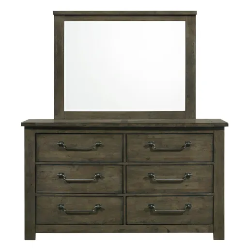 The 6-Drawer Dresser with Mirror in Grey delivers rustic and cozy style to your sleeping space. Features distressing and wood grain detailing throughout for that warm feel. Constructed of sturdy solid and manufactured woods for years of use. Perfect neutral finish for adding to your existing bedroom aesthetic. Complete the look by adding the Panel Bed to your bedroom.