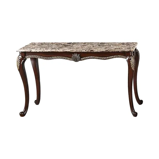 The Royal Classics Maximus Sofa Table in cherry is a perfect blend of heirloom craftsmanship and timeless design. Expertly crafted from solid pine with premium polyurethane carving details, this table offers both durability and long-lasting beauty. The lightweight yet robust carvings are resistant to moisture, rot, and cracking, ensuring their intricate detailing remains flawless over time with minimal maintenance. Finished with a meticulous multi-step process, the table enhances the natural beauty of the wood grain. The traditional Baroque-inspired design features ornate Rococo-style carvings that bring a sense of regal elegance to your home. Topped with a sophisticated marble surface, the rich blend of deep brown tones is accented by intricate white and beige veining, creating a luxurious, dynamic look. The swirling patterns and striking contrast between the dark hues and lighter streaks beautifully complement the ornate wooden base. The perfect statement piece for your hallway, entryway or living room.