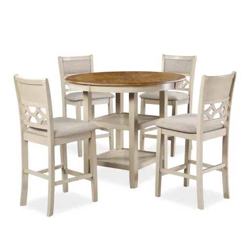 The farmhouse appeal of the Mitchell 5 Piece Counter Dining Table and Chair Set is beautifully created with durability and comfort in mind. This dining set provides spacious seating for four and 2 handy storage shelves located under the table top to display dinnerware or decor. The dining table apron, table legs and dining chair legs are crafted of solid Rubberwood to add strength and stability. The distinctive reverse diamond Mindi wood veneer dining table top accents the beautiful wood grains. A multi-step vintage brown table top and creamy bisque chairs and table base create the heirloom appeal of this family gathering table. The set includes four comfortable dining chairs with 100% polyester beige seat and back cushions. The final touch is Mitchell