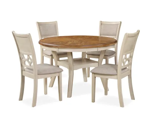 The farmhouse appeal of the Mitchell 5 Piece Dining Table and Chair Set is beautifully created with durability and comfort in mind. This dining set provides spacious seating for four and a handy storage shelf located under the table top to display dinnerware or decor. The dining table apron, table legs and dining chair legs are crafted of solid Rubberwood to add strength and stability. The distinctive reverse diamond Mindi wood veneer dining table top accents the beautiful wood grains. A multi-step vintage brown table top and creamy bisque chairs and table base create the heirloom appeal of this family gathering table. The set includes four comfortable dining chairs with 100% polyester beige seat cushions and backs. The final touch is Mitchell