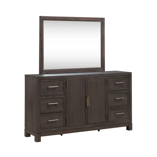 This contemporary dresser and mirror set is the perfect addition to any bedroom. Made from a combination of rubberwood solids and melamine, it boasts a dark wood tone that adds a touch of sophistication to the room. The caffe finish gives it a warm and inviting appearance.