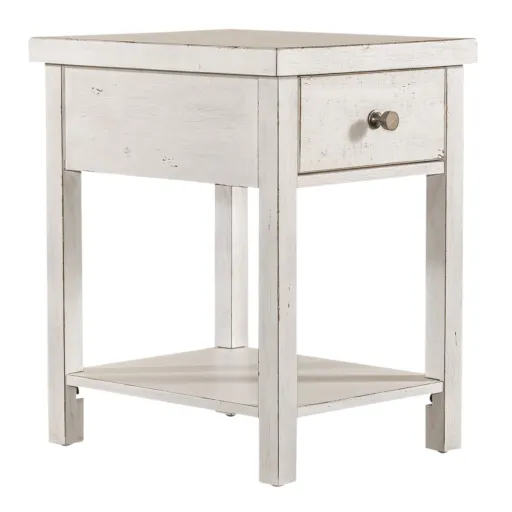 Enhance your space with the Modern Famrhouse chair side table. Crafted of poplar solids with knotty white oak veneers, this piece features a flea market white finish with heavy distressing, a full extension drawer with a bottom shelf for additional storage, appealing washed brass knob hardware. Also available in an alternate finish, this modern farmhouse piece would be a wonderful addition to your cottage or contemporary style space.