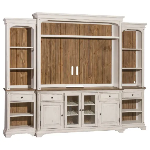 Combine traditional living and todays modern lifestyle effortlessly with the Morgan Creek entertainment center with piers. Crafted with polar solids with pine and birch veneers, this piece features a two tone finish, wood framed doors, removeable side molding, adjustable shelving and led touch lighting to illuminate the piece. Wire management provisions effortlessly accommodates a DVD player or gaming console of choice. The warm antique finishes and artistic distressing along with grand scale, makes this a piece to be passed on to generations.