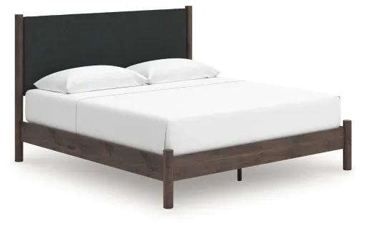 Crafted with both form and function in mind, this king upholstered panel platform bed brings a dash of retro-cool character to your modern boho aesthetic. Its textured black headboard fabric adds a trend-right touch to the classic silhouette. Warmly welcoming with a rich brown finish, the bed pairs well with muted hues, earth tones and other neutrals alike. What a refined take on easygoing style.
